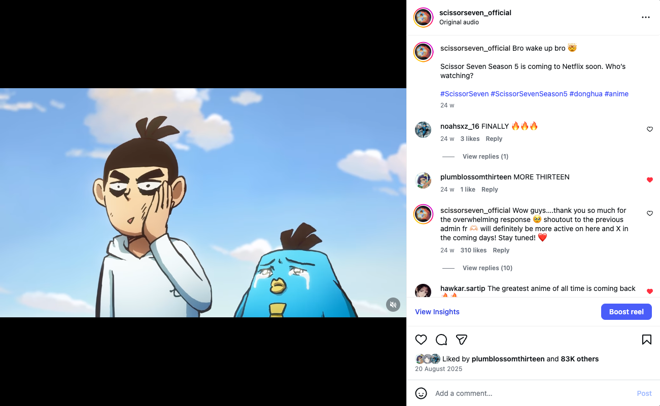 Scissor Seven’s official overseas social media accounts have long surpassed being simple information bulletin boards. Through high-frequency fan interaction, they continuously maintain intimacy and a sense of being “online,” and by setting up “Fanart Friday,” they encourage fan creations. The essence of this strategy is to convert fans’ vigorous secondary-creation enthusiasm into a native content source that sustains the IP’s heat, forming a sustainable co-creation loop between official and fans—so the IP stays fresh even during the gaps while waiting for new season updates.