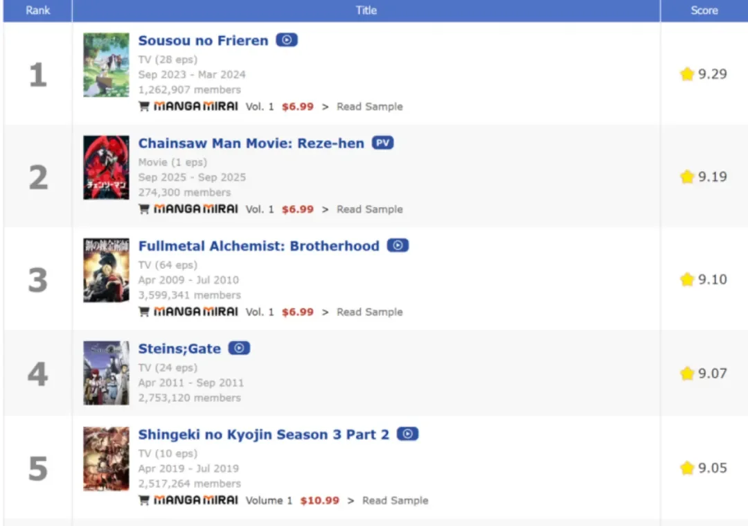 The top five of MAL’s overall ranking are all Japanese animation